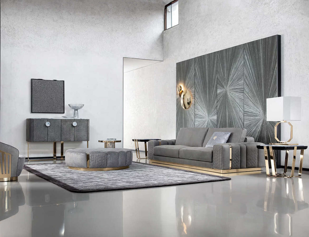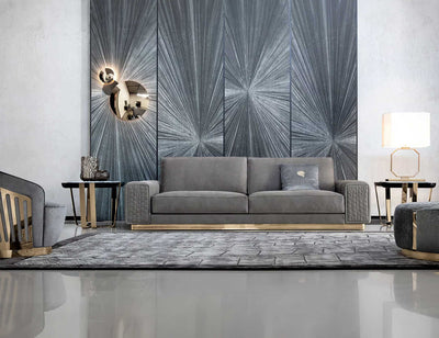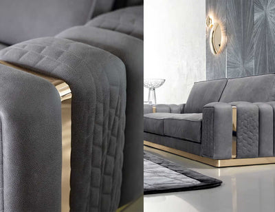 Chiếc sofa được trang bị ghế và các bên có đường may đặc biệt, được làm từ mút Latex IFD, đảm bảo độ êm ái. Các tay vịn của sofa được thiết kế tỉ mỉ với việc hoàn thiện đặc trưng, tạo thêm một chút sự thanh lịch cho tổng thể. Cơ sở và các viền kim loại trên tay vịn được hoàn thiện bằng inox lập la mạ PVD vàng nhẹ, mang lại độ bền và sự quý phái. Sự kết hợp này giữa các vật liệu và sự chú ý đến chi tiết tạo ra một chiếc sofa không chỉ mang lại sự thoải mái mà còn phát ra vẻ đẹp sang trọng và phong cách.