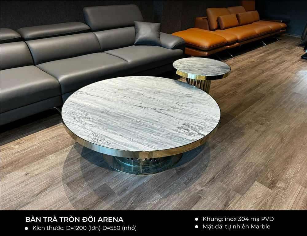 Sản phẩm có sẵn - Bàn trà tròn đôi Arena mặt đá Marble, khung inox mạ PVD vàng bóng